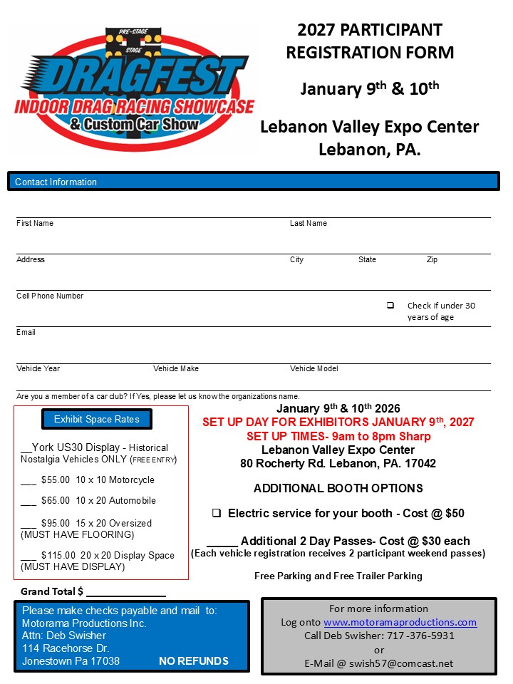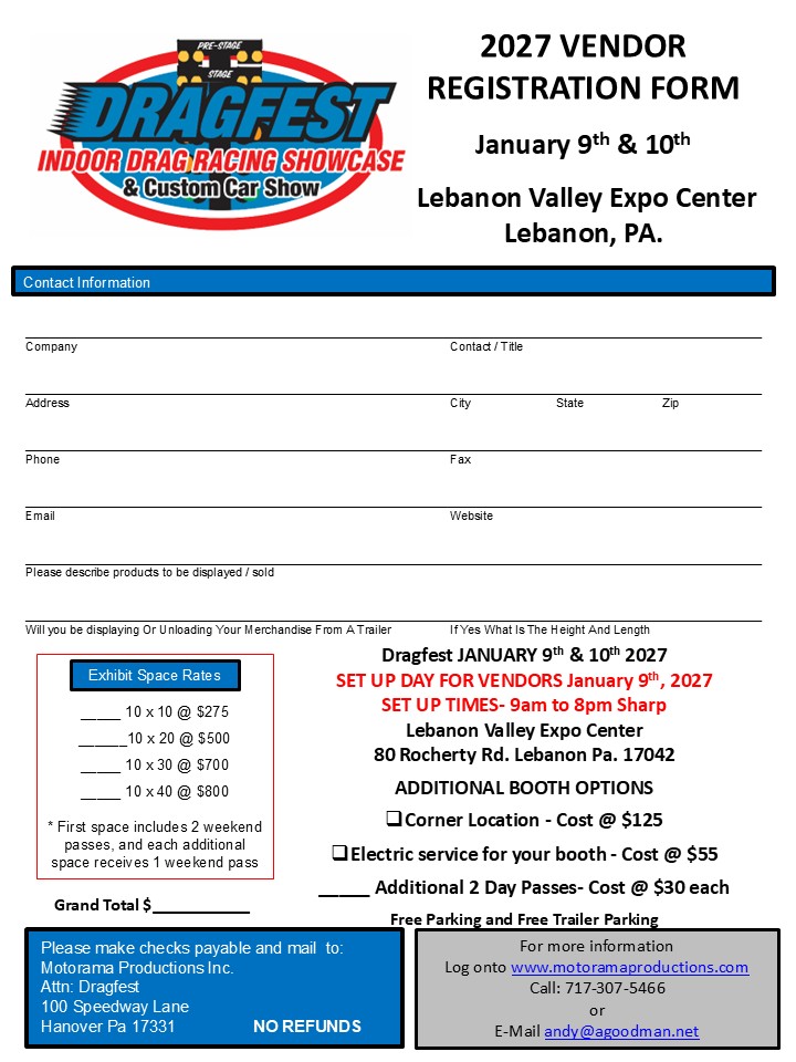 Are you interested in selling your goods and wears at the Dragfest Indoor Drag Racing Showcase? Dragfest in Lebanon, Pennsylvania is “the” place where automotive and motorsports enthusiasts congregate to share their hobby of drag racing every year the second weekend of January. With more than 200 drag machines on display, automotive enthusiasts from around the local area and afar; come to get an escape from the winter blues. The nearly 100,000 sq. foot facility is filled wall to wall with various automotive racing exhibits. No matter what you sell, from automotive parts, apparel, candles to custom art work, die-cast cars to vacations, there will be nearly 10,000 consumers spending the weekend inside a venue filled with action, activities and live entertainment. There truly is no better place to be in the dead of winter. So what are you waiting for?