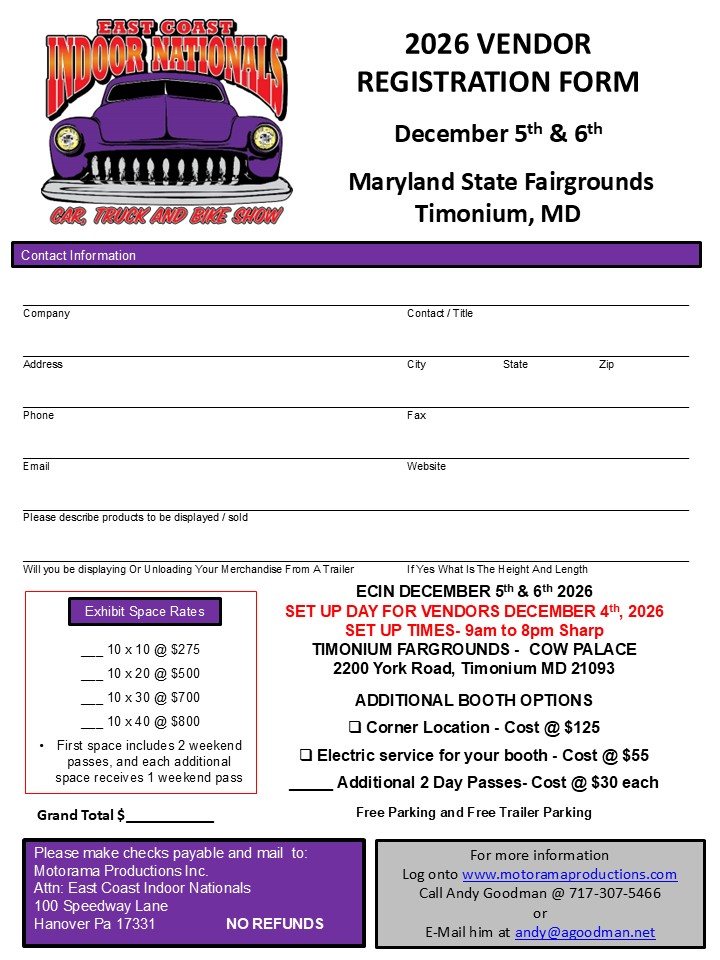 Are you interested in selling your goods and wears at the East Coast Indoor Nationals? The East Coast Indoor Nationals in Timonium, Maryland is “the” place where automotive and motorsports enthusiasts congregate to share their hobby every year in early December. With hundreds of vehicles on display, automotive enthusiasts from around the local area and afar come to get an escape from the winter blues as the nearly 200,000 sq. foot facility is filled wall to wall with various automotive exhibits. No matter what you sell from automotive parts to apparel, candles to custom art work, die-cast cars to vacations there will be nearly 10,000 consumers spending the weekend inside a venue filled with action, activities and live entertainment. There truly is no better place to be in the dead of winter. So what are you waiting for?